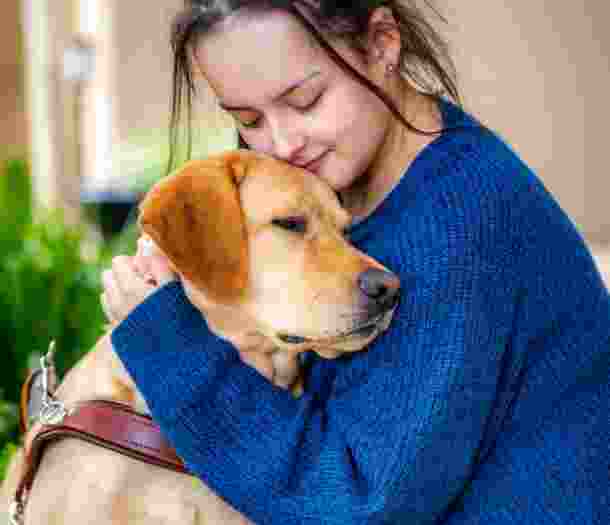 Alana cuddling yellow Labrador Guide Dog, Rocket, outside.
